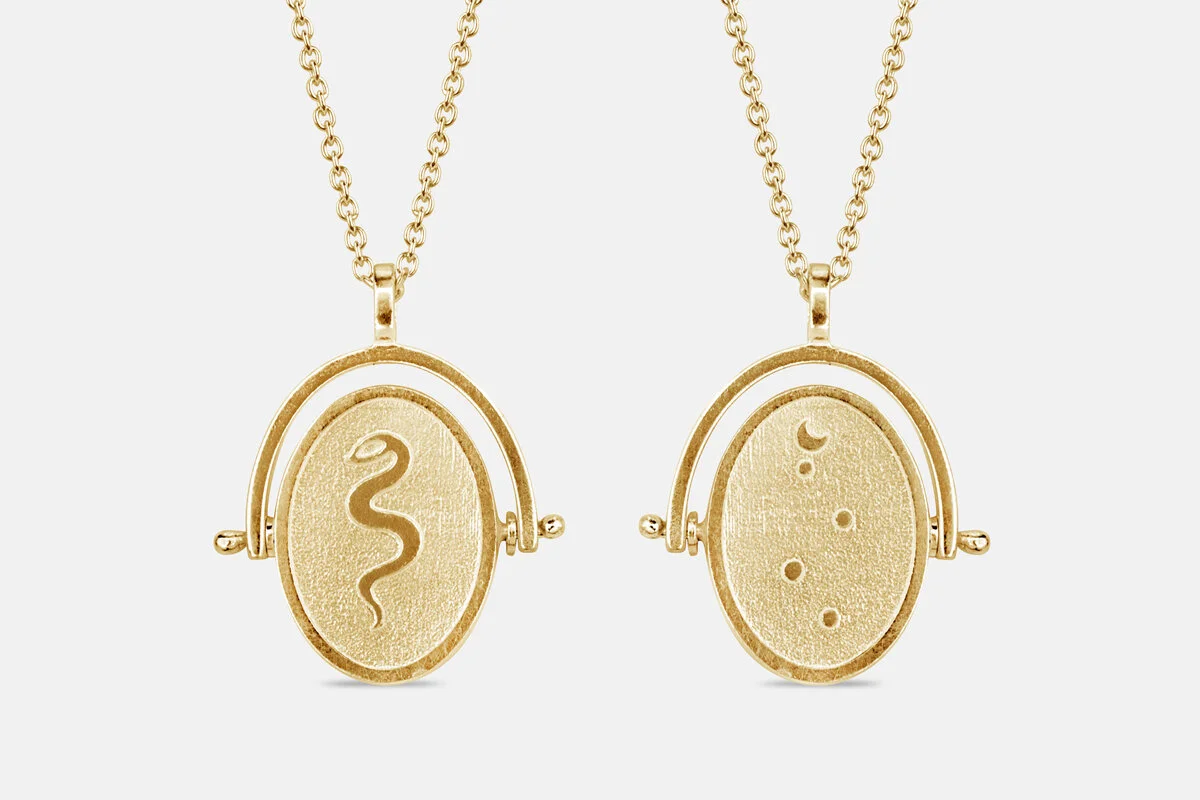 To do this while you’re wearing the necklace, take a breath, centre yourself and clear your mind. Lift the necklace, spin the spinner, and as it spins, let it drop onto your chest. The symbol that lands face-up is the aspect of the talisman that is manifesting.